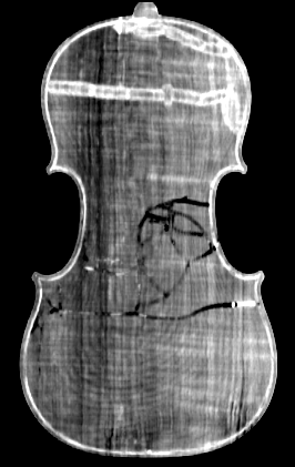 A Rugeri cello showing the multiple patches on the belly and back plus quite a lot of distortion.